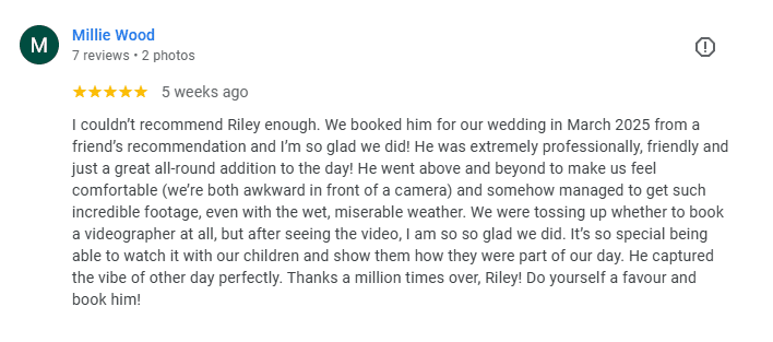 Every shot is framed with care. Every cut is made with meaning. I want every wedding film I make to feel like your story, told beautifully and truthfully. Because at the end of the day, it's not just a video. It's a memory, and I want it to feel just right every time you watch it back.